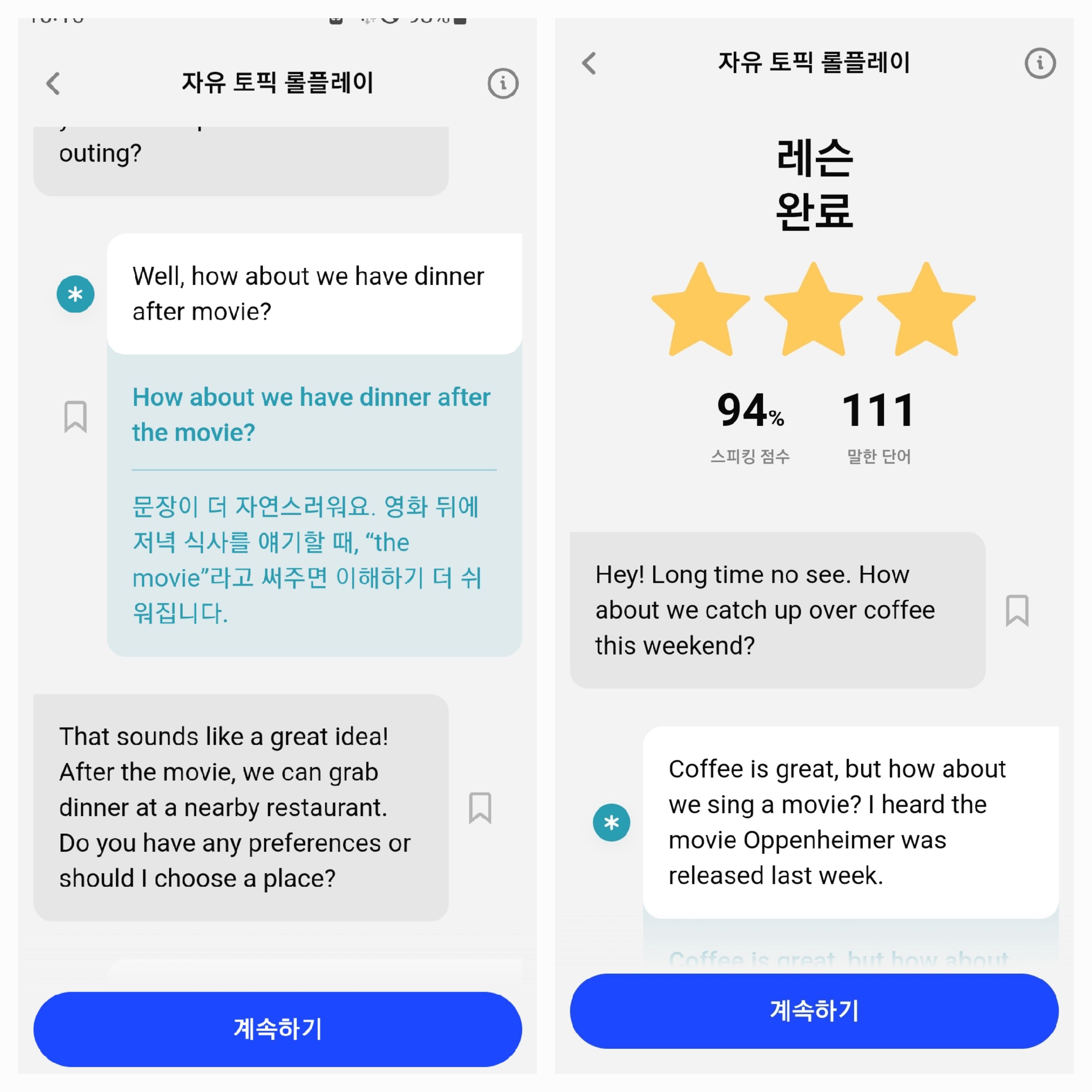 밤이건, 새벽이건 맘껏 영어로 대화할 수 있으니 스피킹 실력도 빨리 늘고, 낯선 사람들과 억지로 꾸며진 대화를 하지 않아도 되니 제 성향에 AI 대화가 너무 딱! 이에요