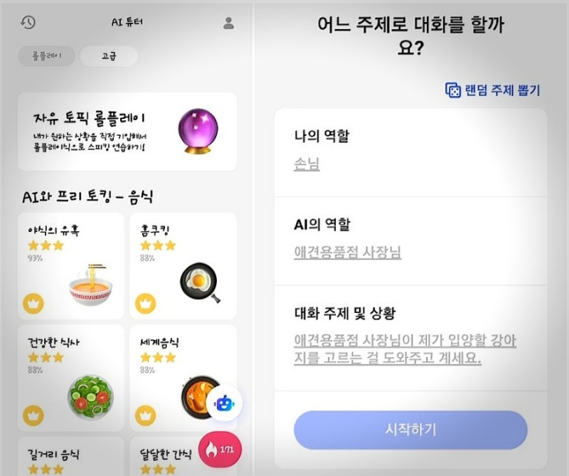 인공지능 AI 와 영어로 프리토킹을 하는 콘텐츠로, 다양한 주제로 대화할 수 있으며, 또 내가 원하는 상황을 설정해서 AI 와 상황연극 즉, 롤플레잉 게임을 할 수 있어요!