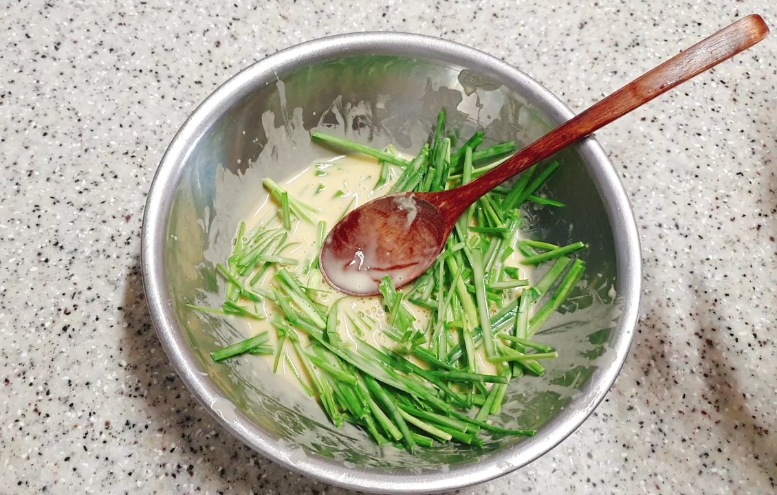적당하게 자른 부추에 밀가루, 소금, 계란을 넣어서 반죽한 다음, 노릇노릇하게 부쳐줘요!