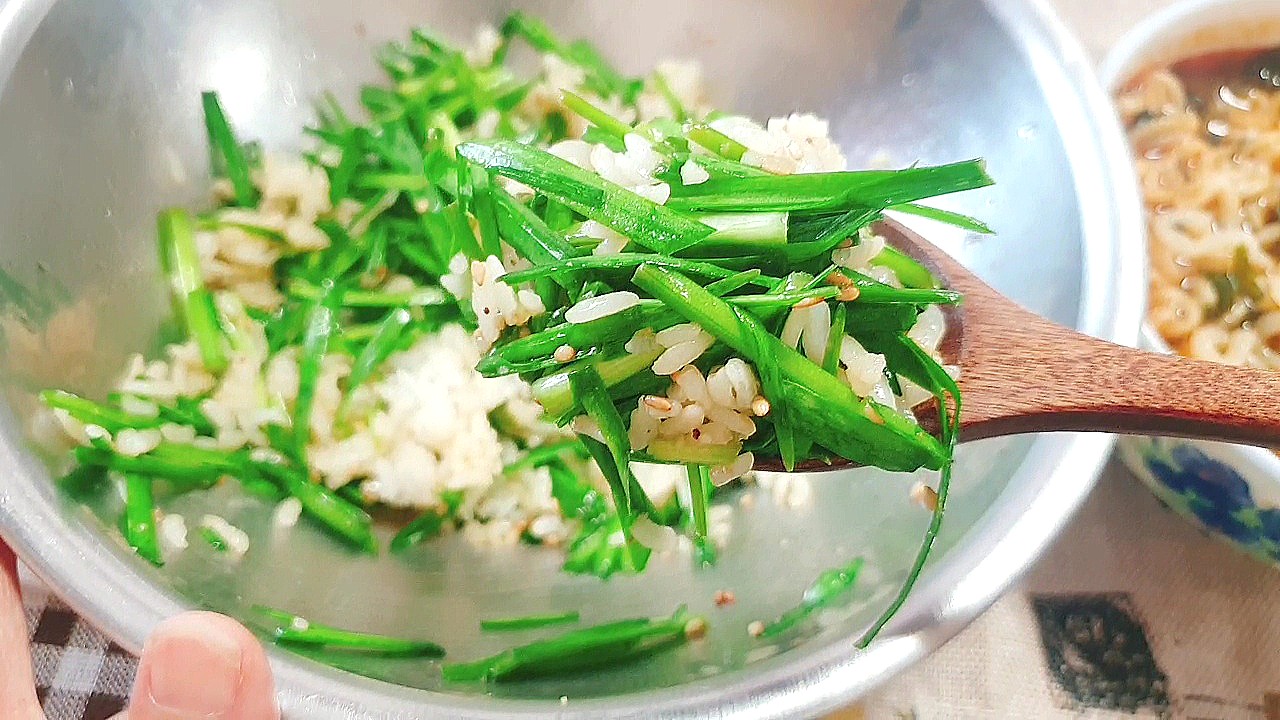 여기에 밥 넣고 비벼주면 부추비빔밥이 되는 거예요.