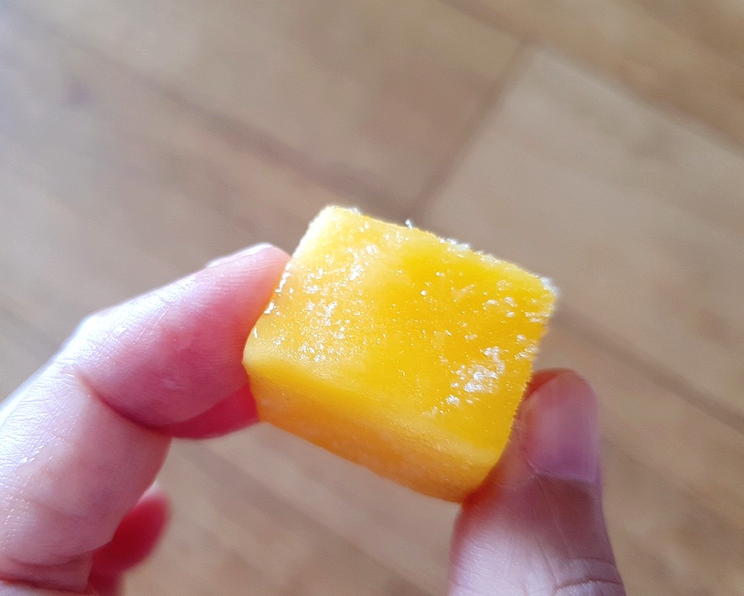 잘 익은 망고 과육이 큐빅처럼 잘라져 있는 냉동망고예요.
