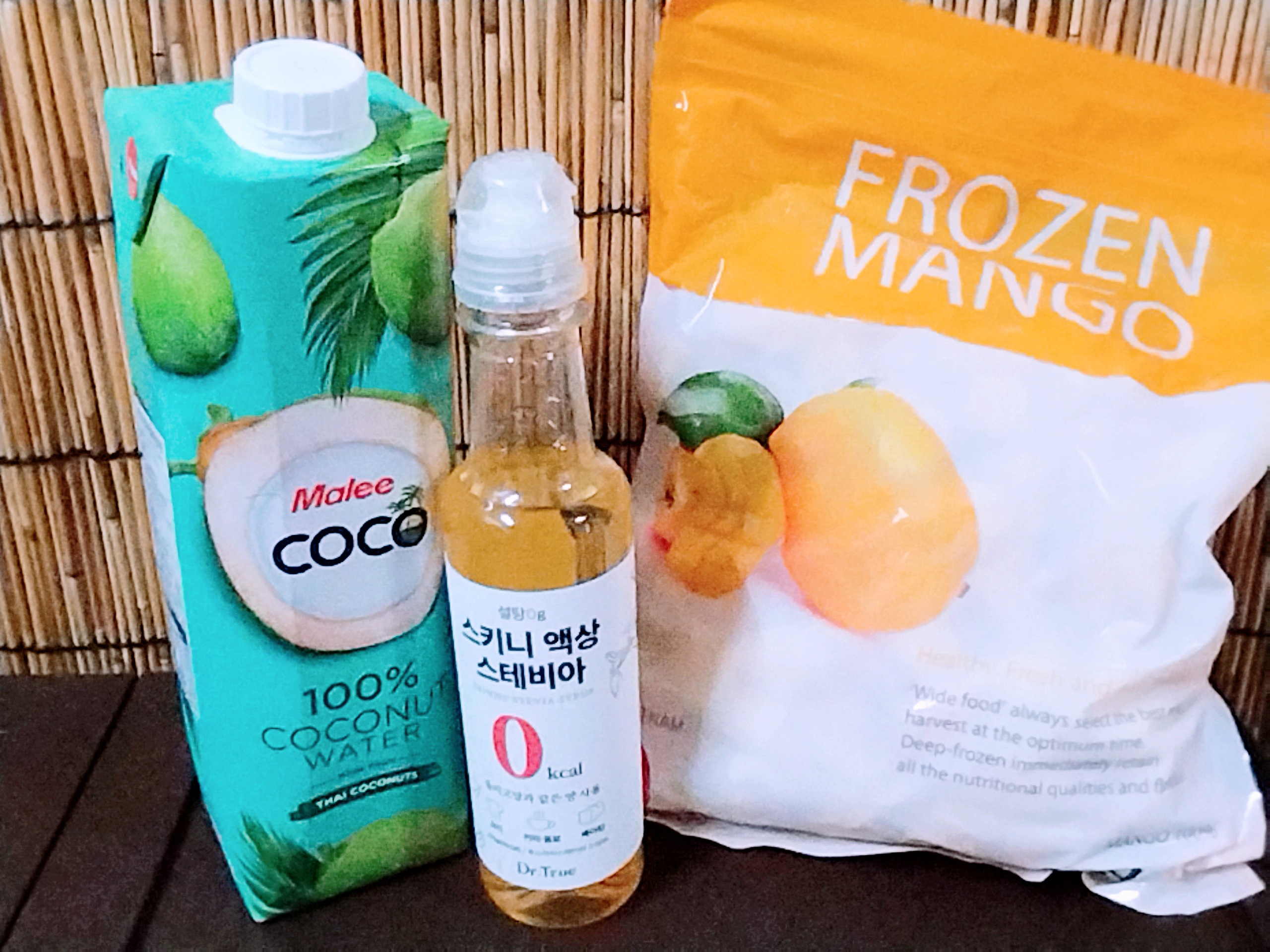 냉동망고, 코코넛워터, 스테비아 시럽 이 필요해요.
